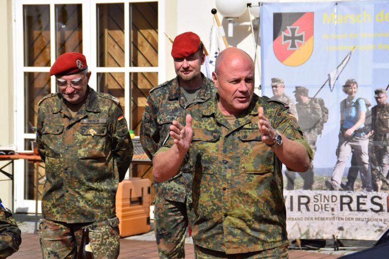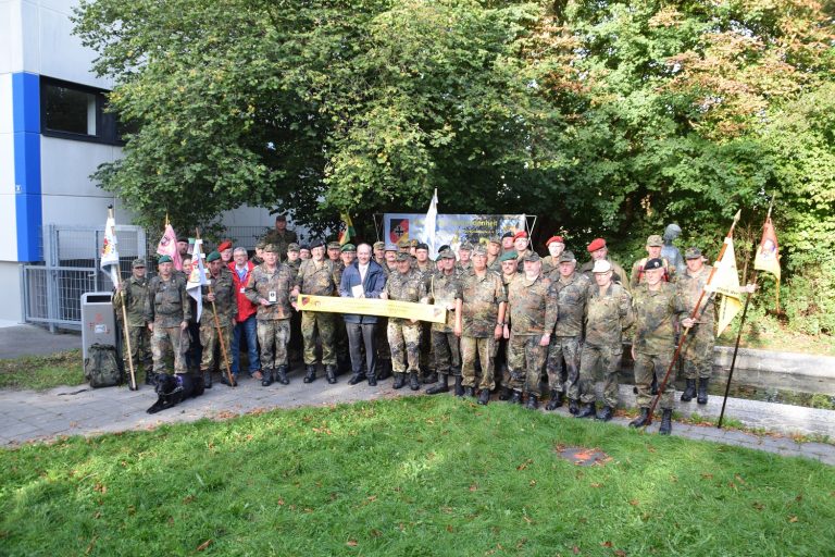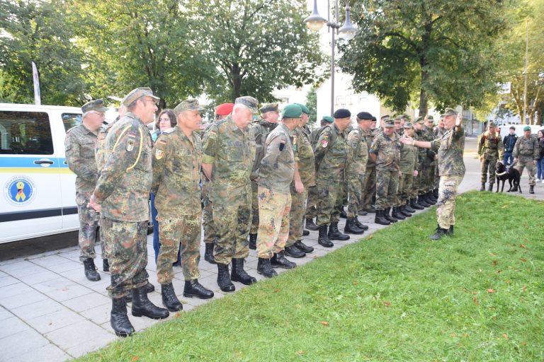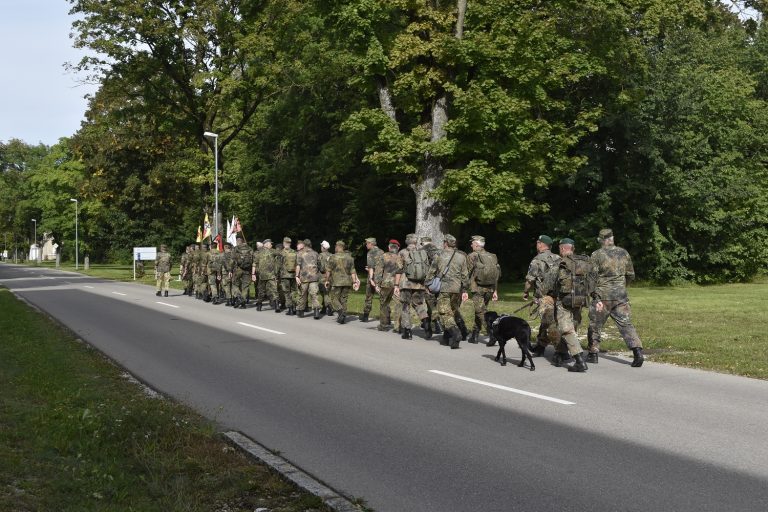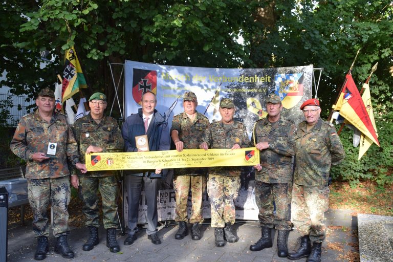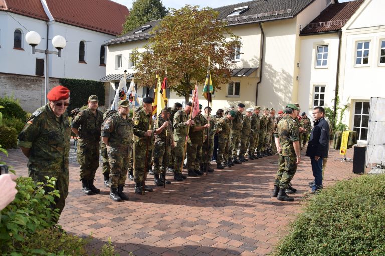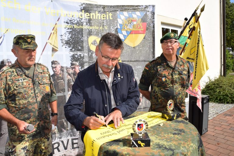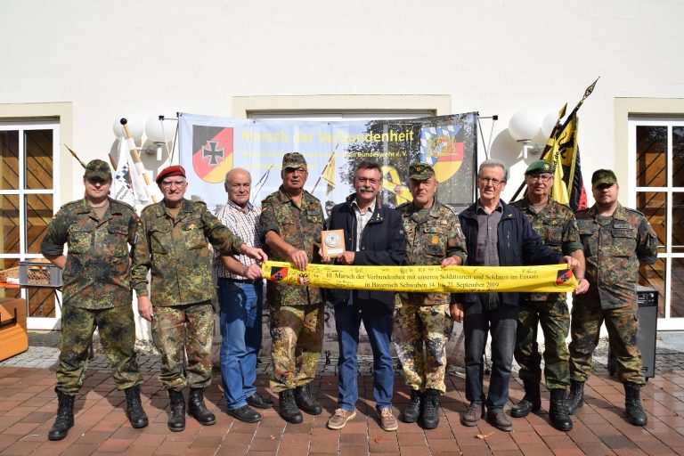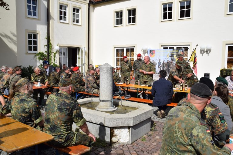 Eintreffen am Rathaus/ Kirchplatz in Oberottmarshausen, Begrüßung durch den Bürgermeister und Mittagsverpflegung durch die Gemeinde. Besuch Kommandeur Regionalstab für Territoriale Aufgaben der Bundeswehr Süd Oberst d. R. Roland Hettmer.