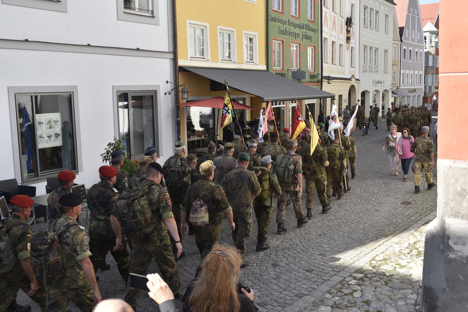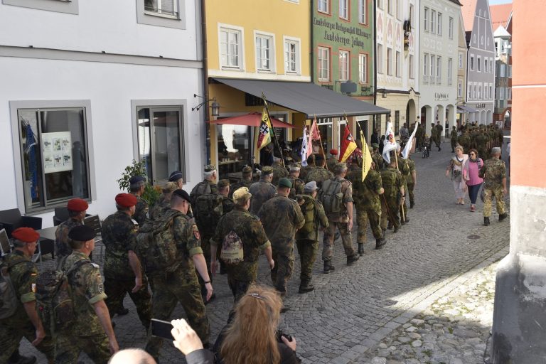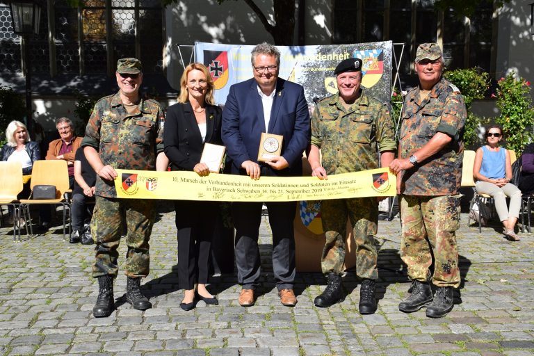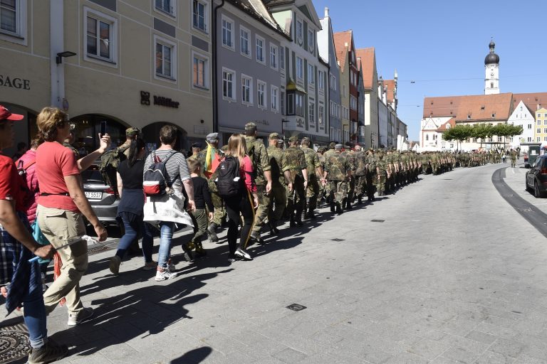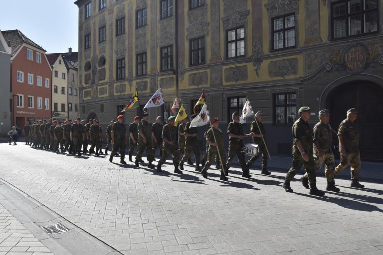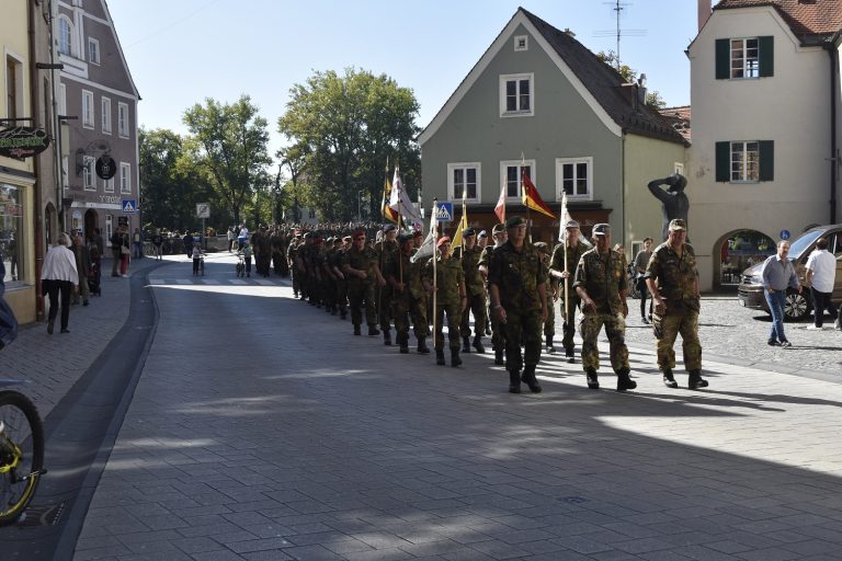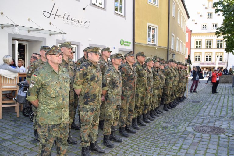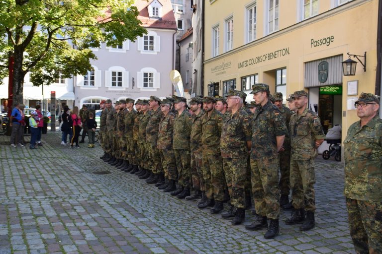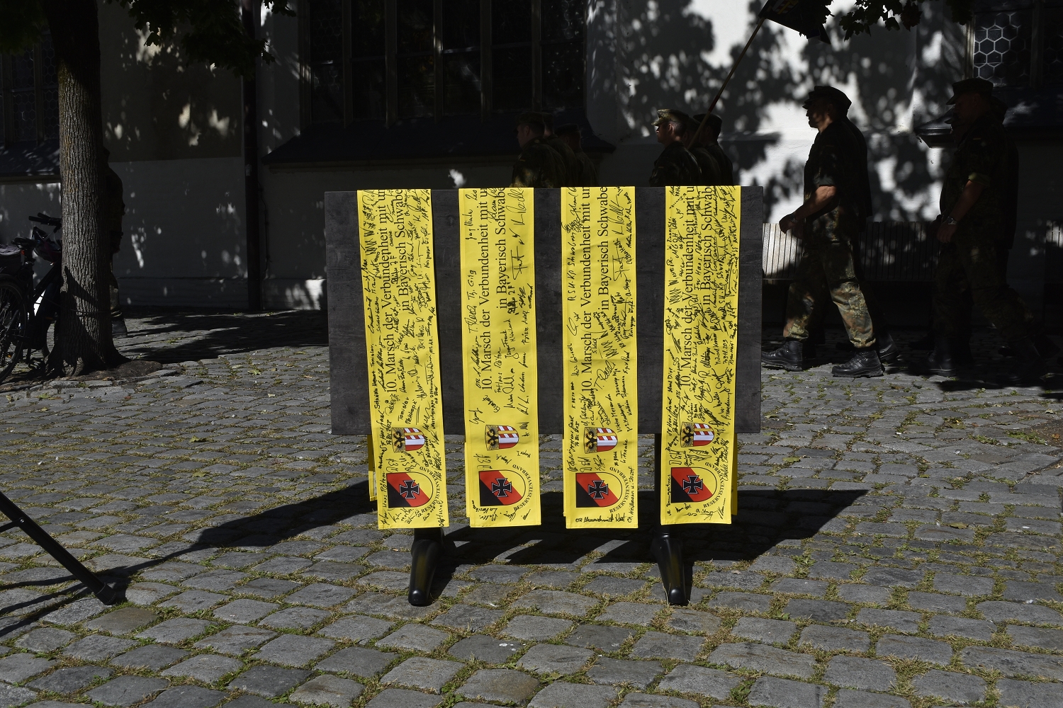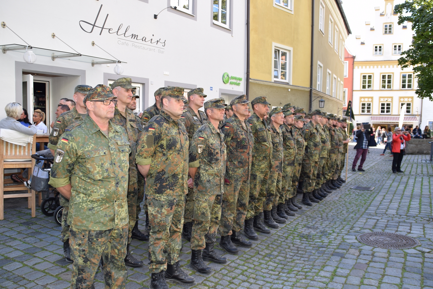 Antreten der Marschteilnehmer und der RSU Kompanie Schwaben auf dem Marktplatz zum Abschluss-Appell mit Ansprache der Bürgermeisterin und des Kommandeurs Regionalstab Süd. Übergabe des Marschwimpels an den Beauftragten des Marsches der Verbundenheit.