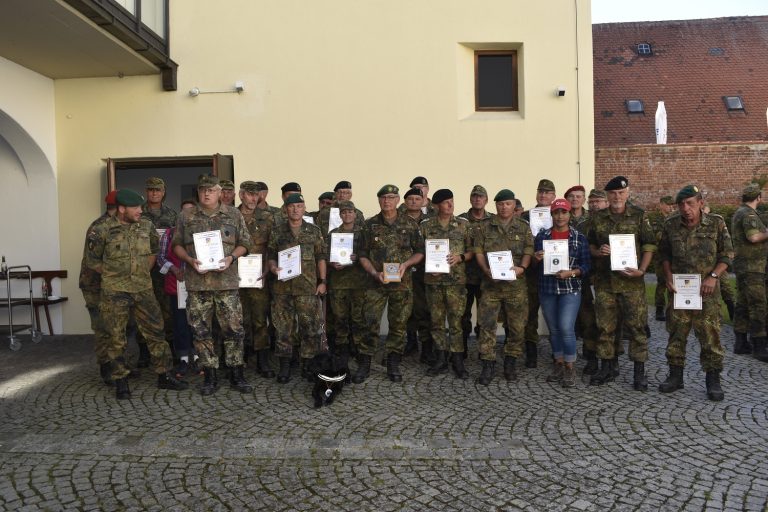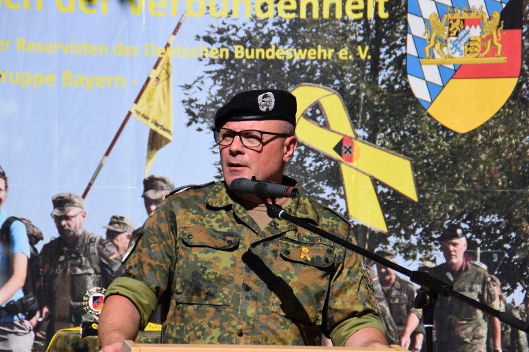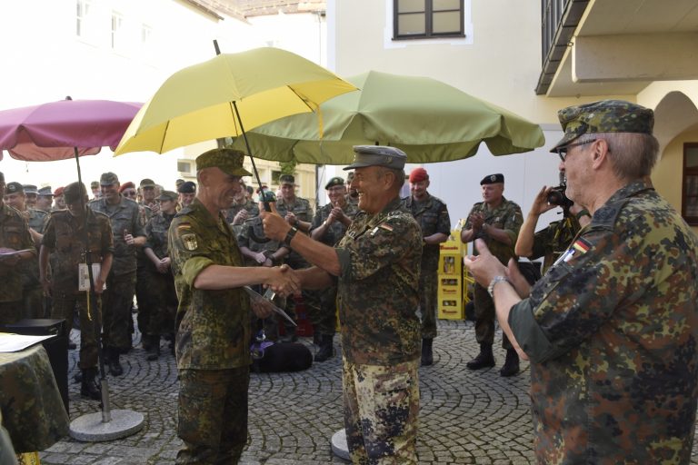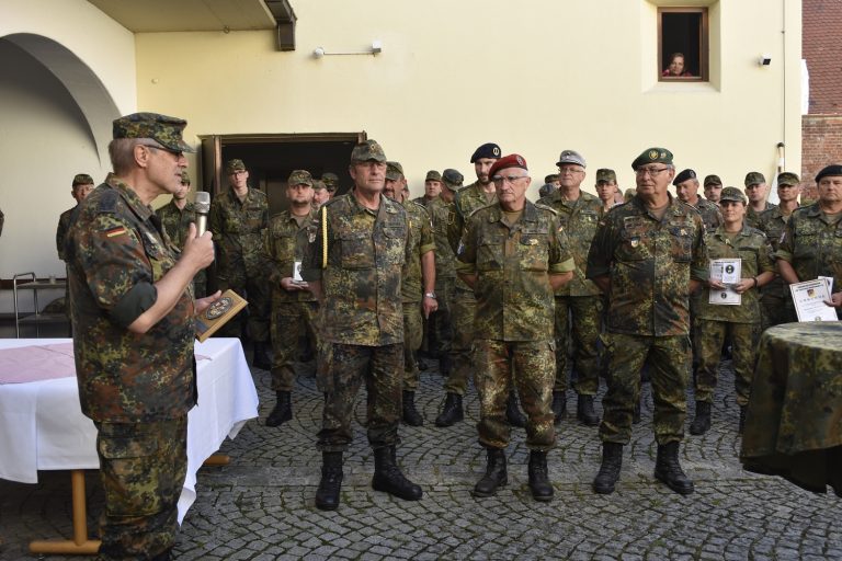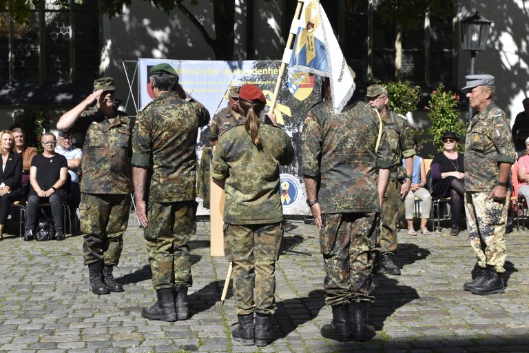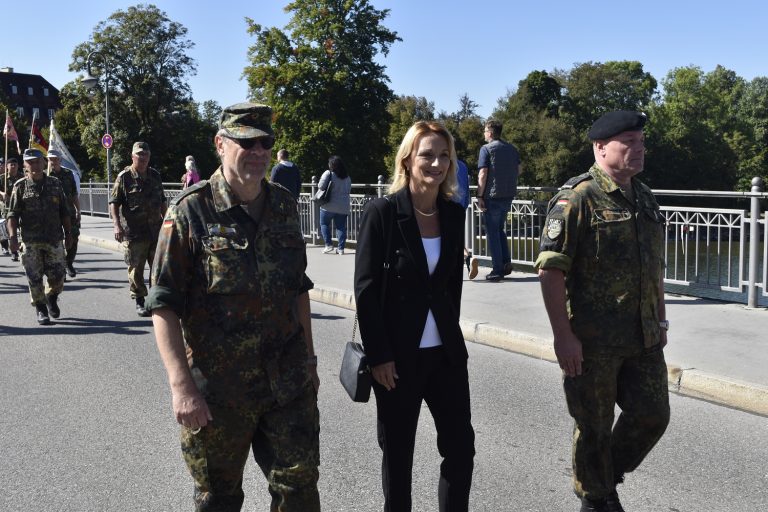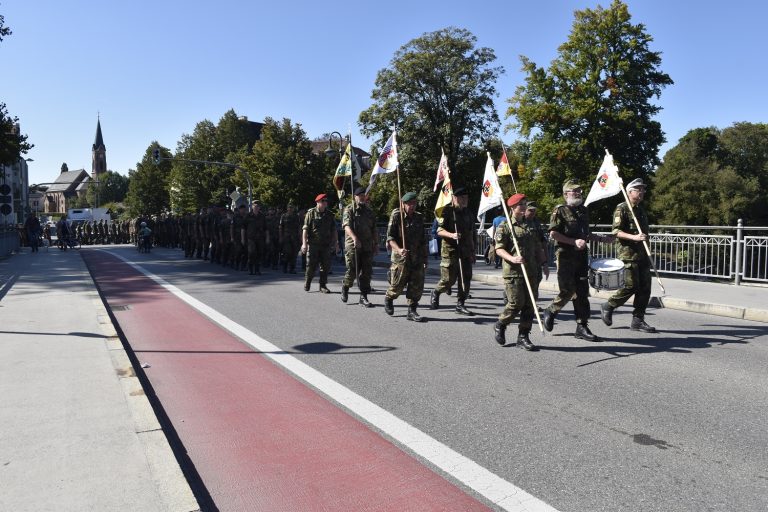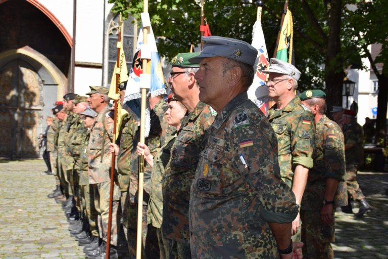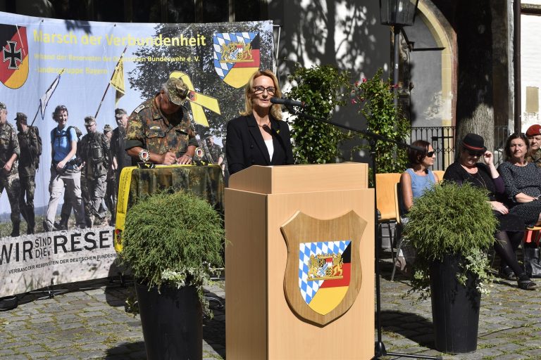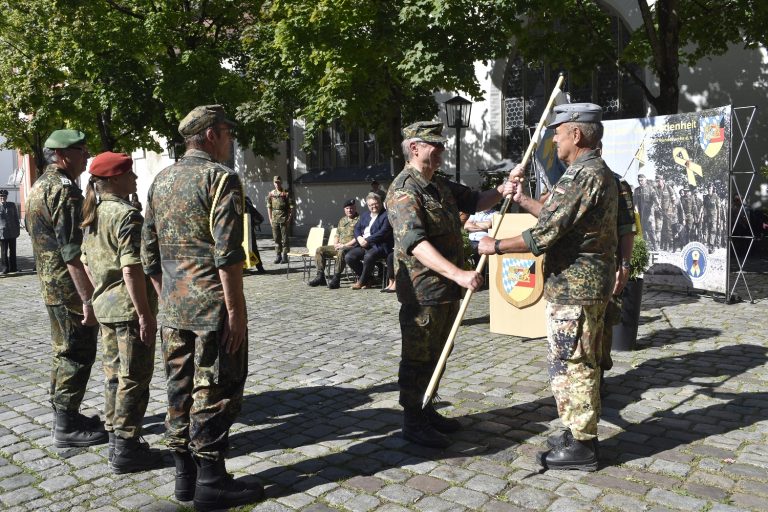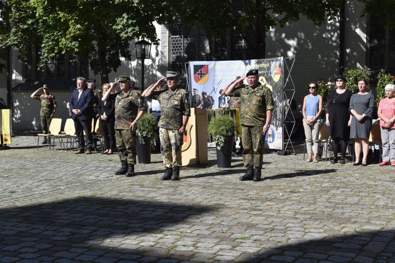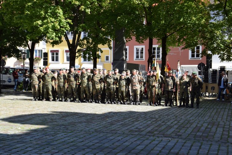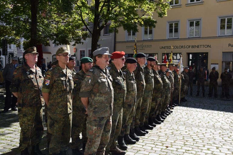Antreten der Marschteilnehmer und der RSU Kompanie Schwaben auf dem Marktplatz zum Abschluss-Appell mit Ansprache der Bürgermeisterin und des Kommandeurs Regionalstab Süd. Übergabe des Marschwimpels an den Beauftragten des Marsches der Verbundenheit.